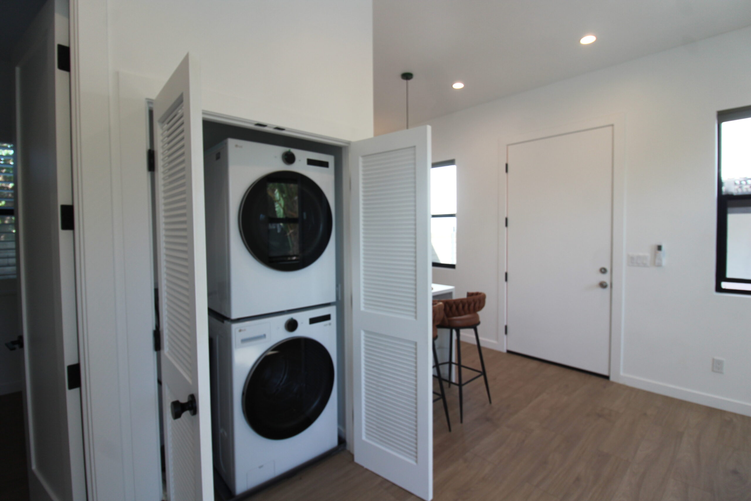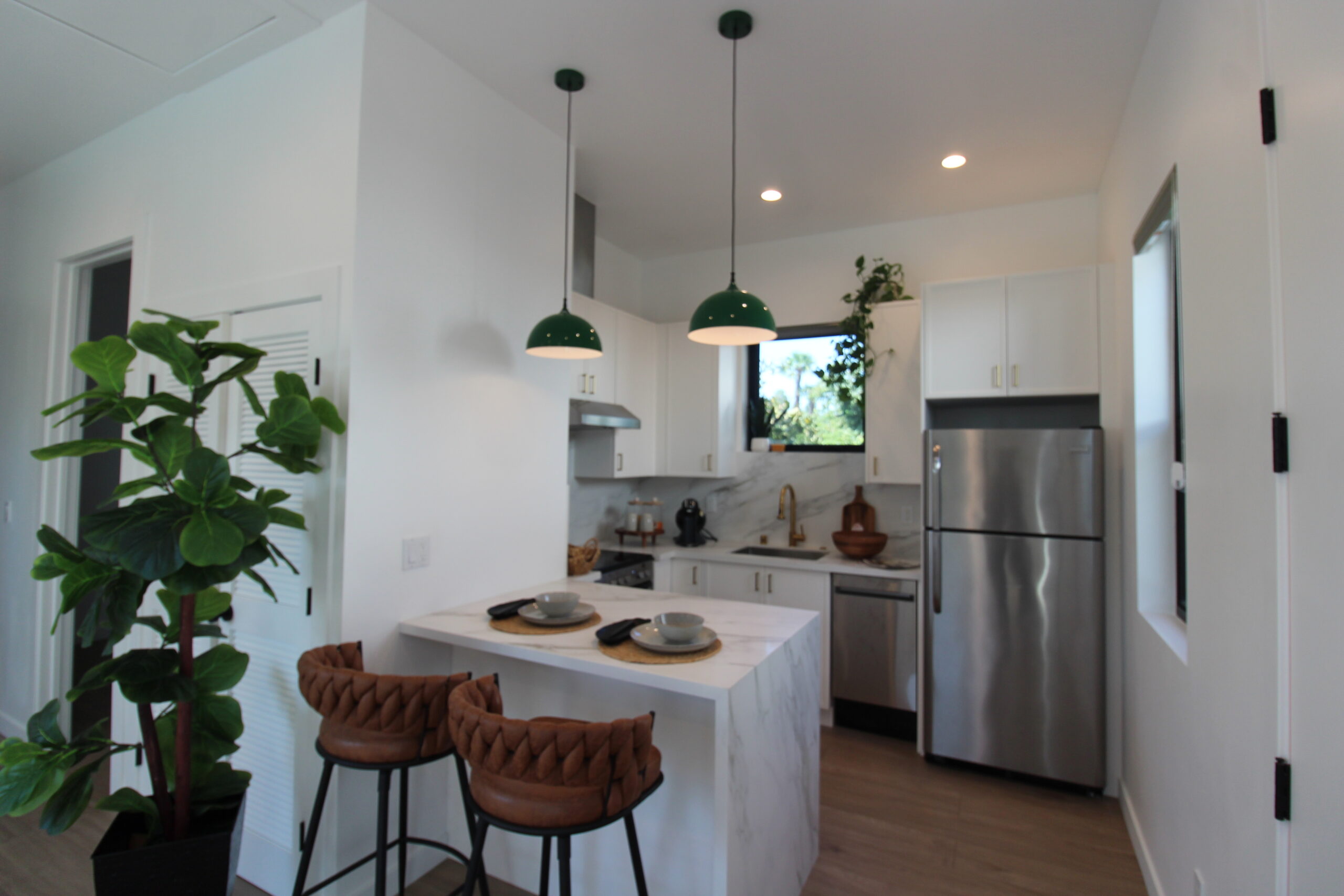 This newly completed ADU showcases a modern, open-concept design with high-end finishes that maximize both style and functionality. Kitchen: Sleek white cabinetry with a glossy finish gives a clean, contemporary feel. Full-height marble-style backsplash and countertops add elegance and durability. [